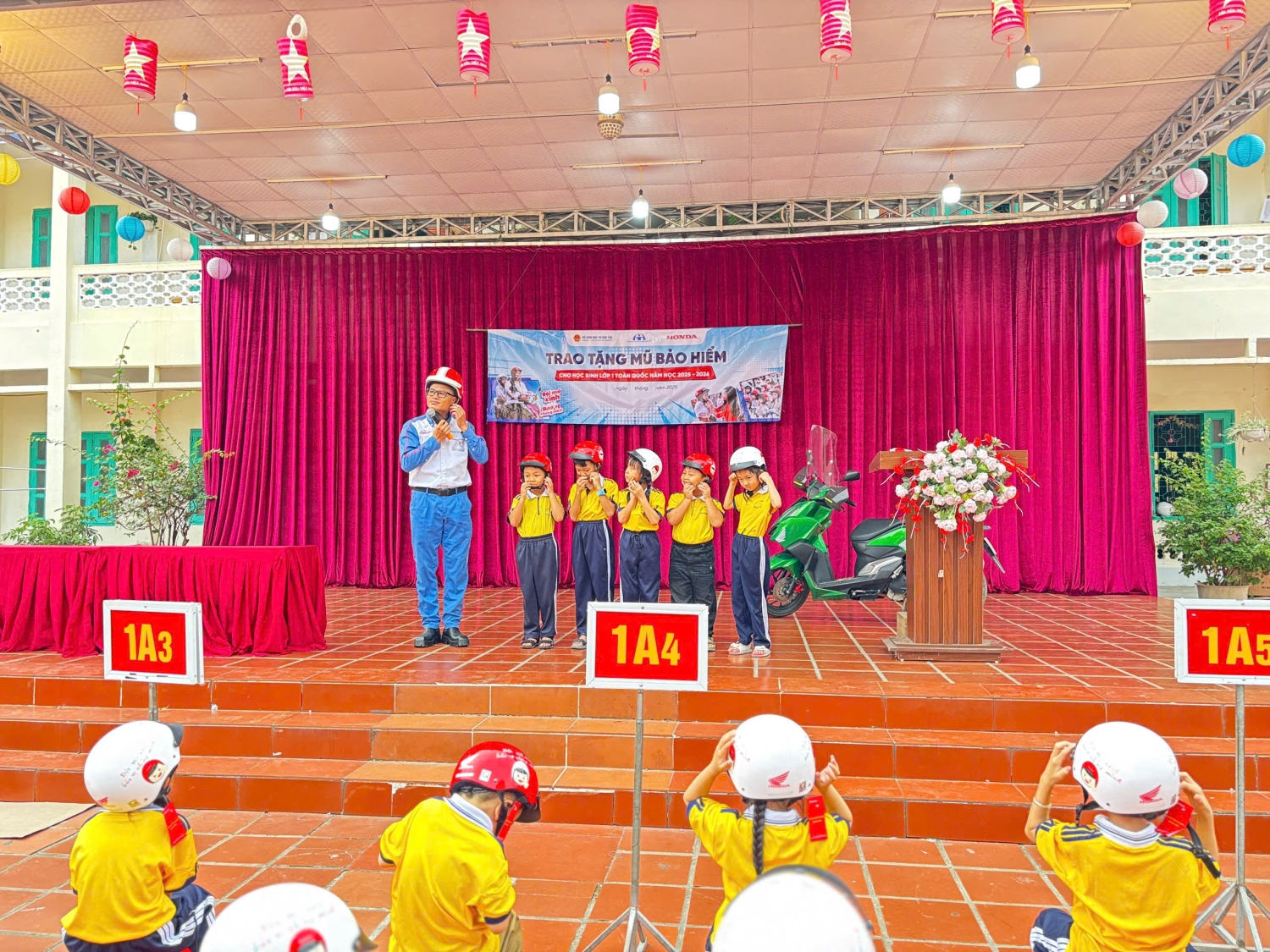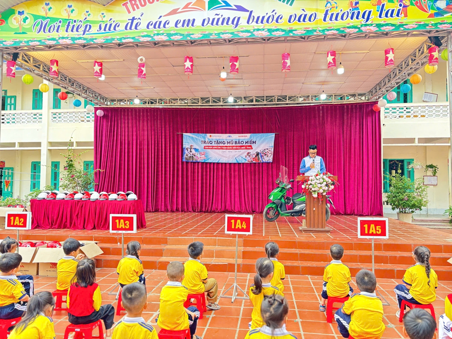 Sau phần trao mũ, cán bộ đại diện đơn vị đồng hành cùng công ty Honda Việt Nam tại tỉnh Điện Biên đã có buổi tuyên truyền ngắn gọn, sinh động về an toàn giao thông đường bộ cho học sinh. Bằng những hình ảnh trực quan, câu chuyện vui và phần hỏi - đáp thú vị, các em nhỏ đã được tìm hiểu về: